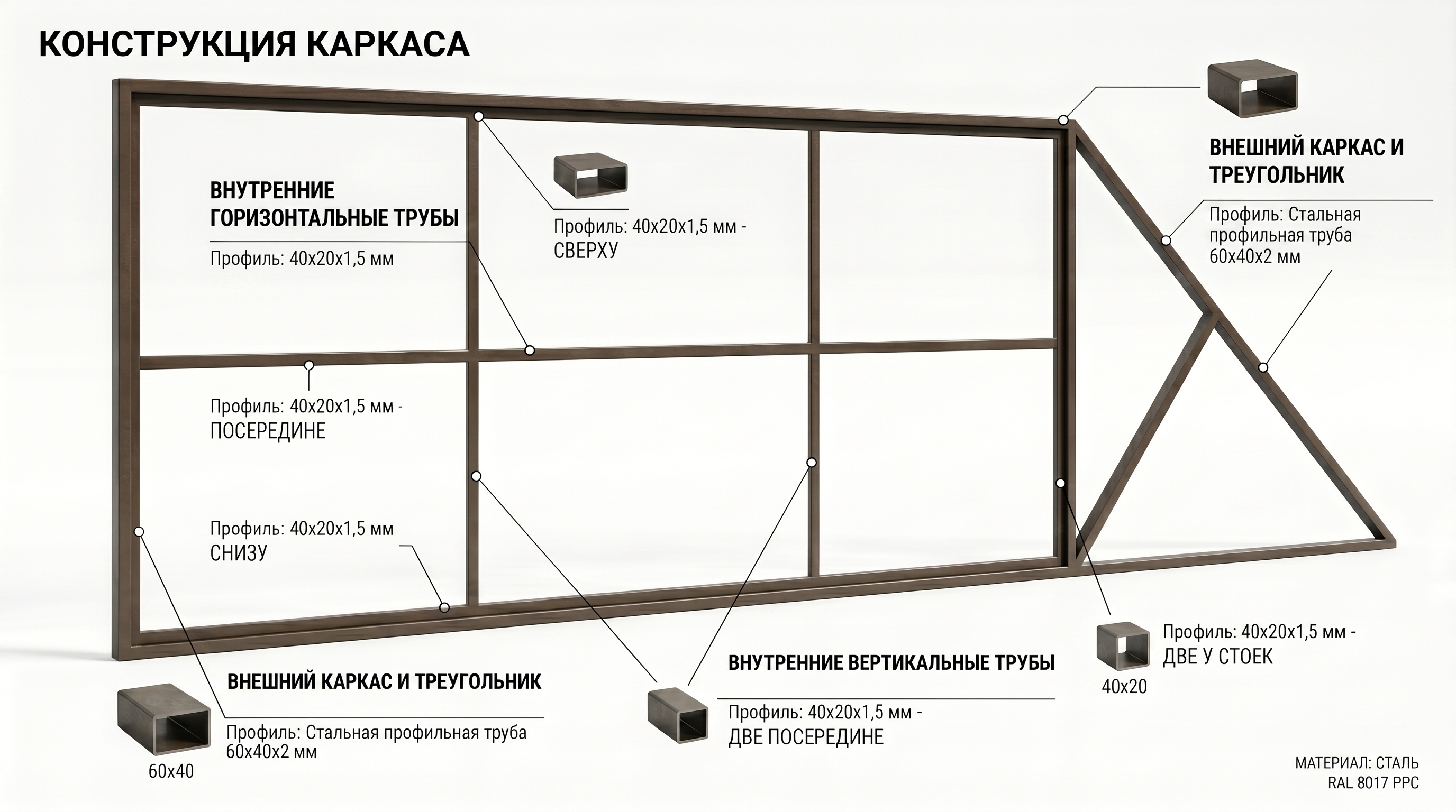 Внутренний каркас из трубы 40×20×1,5 мм формирует внутреннюю раскладку створки и помогает равномерно распределять нагрузку по всему полотну. Это важно для дальнейшего крепления заполнения и для сохранения плоскости изделия.