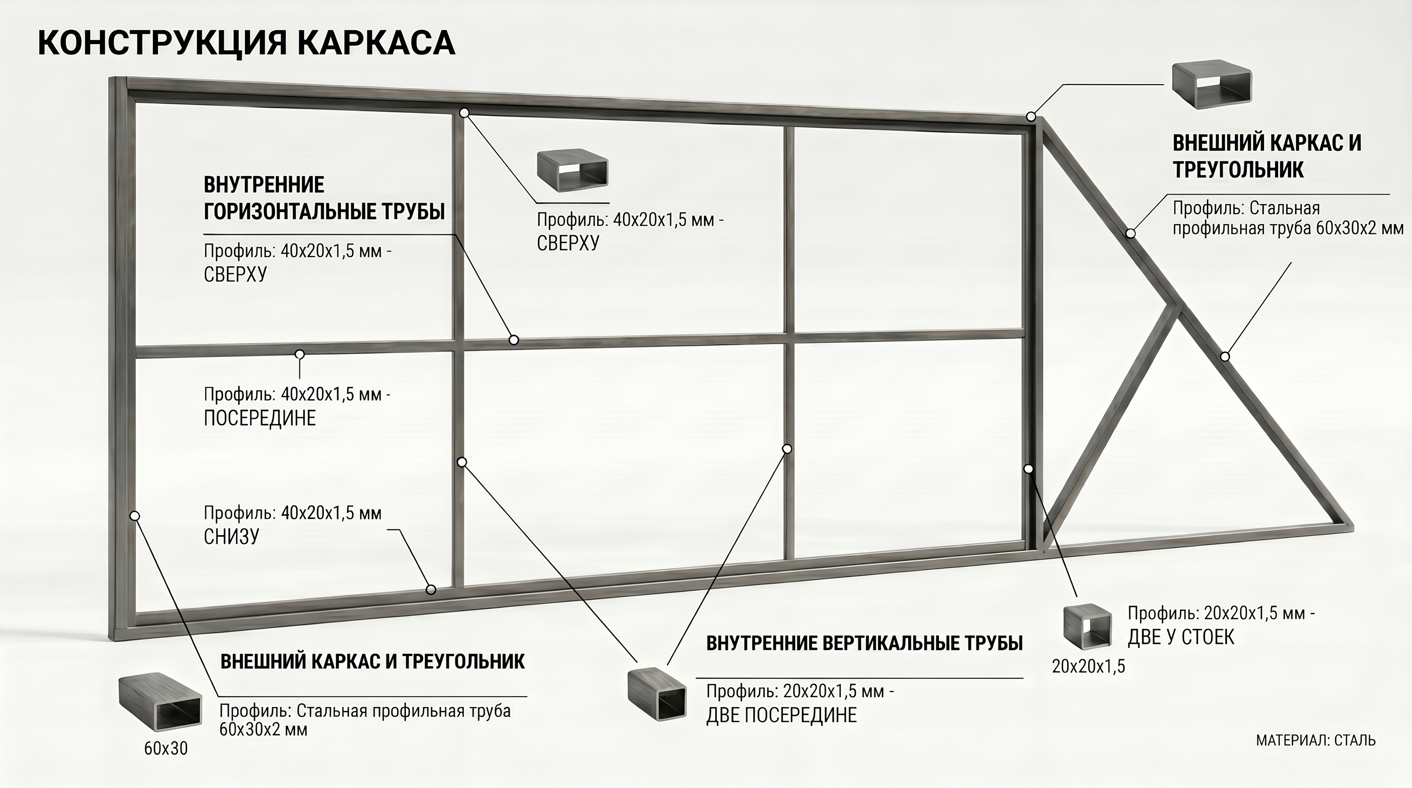 Профиль 40×20×1,5 мм обычно используется для внутреннего каркаса. Он формирует основные внутренние перемычки и делает створку более устойчивой к деформации. За счёт этого ворота лучше держат плоскость и стабильнее работают при заполнении металлом.