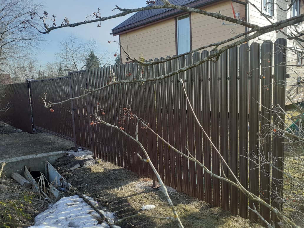· эстетичный внешний вид. Коричневый штакетник, установленный в городе Гатчина, универсальный выбор. Он будет смотреться современно, стильно и надежно. А со временем не утратит своих характеристик.