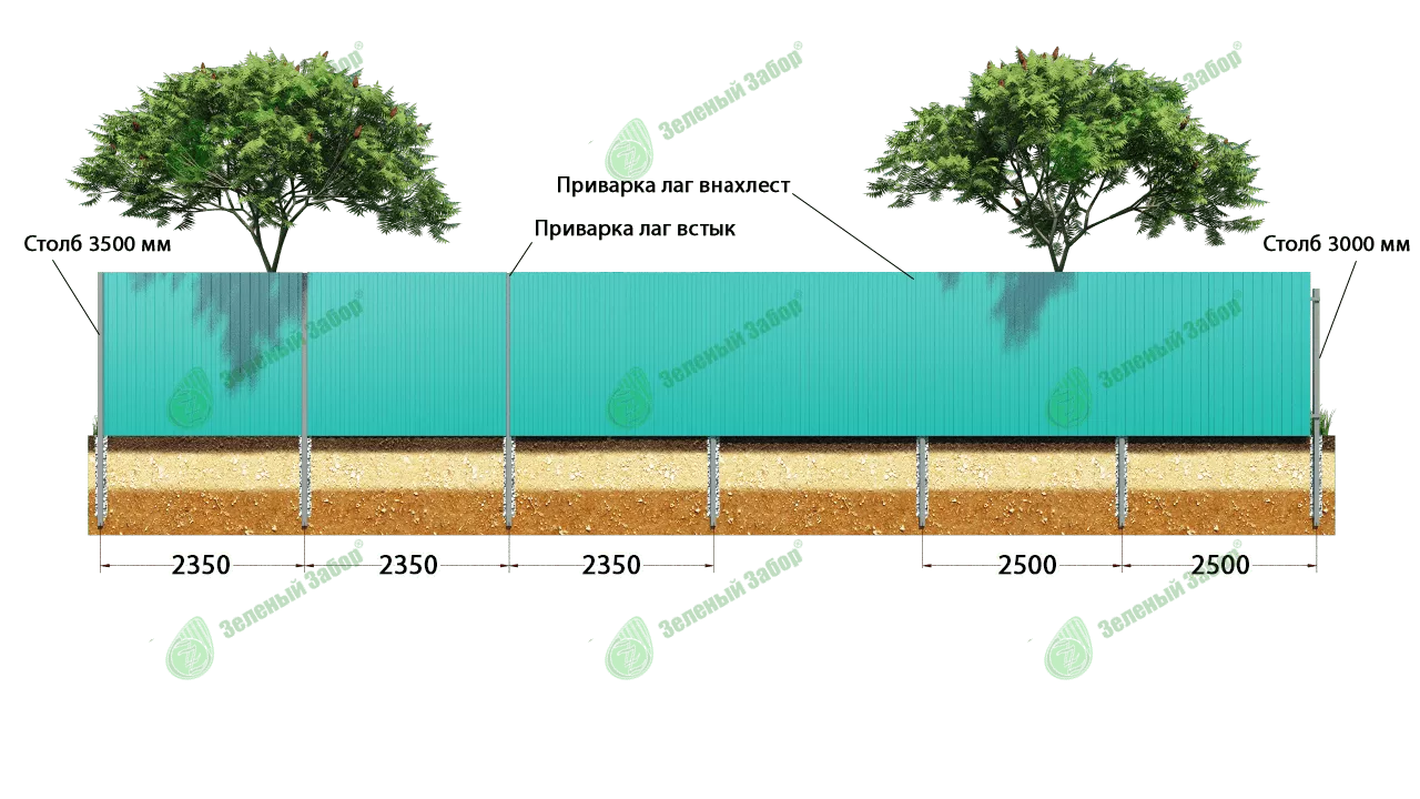 Рисунок 3 При монтаже забора с столбами, которые должны быть видны ещё нужно учесть расстояние между столбами при условии монтажа каркаса для профнастила. Дело в том, что расстояние между столбами будет меняться в меньшую сторону. Исключение — забор из евроштакетника. Следовательно, количество столбов возрастёт. А вот, сколько именно понадобится столбов, зависит от общего метража забора и выбранного Вами профильного листа. Шаг между столбами равен Х*2, где Х — это рабочая ширина профлиста. Таким образом, если сделать все расчёты, можно увидеть перерасход по лагам, шаг между столбами при максимальной ширине листа получится 2,35 м, следовательно, от каждой лаги надо будет отрезать 65 см. В стоимости данного каркаса для забора будет учтен целиковый материал без сварных швов, что предполагает дополнительные расходы и увеличение стоимости. Если же вы решите остановиться на евроштакетнике, то шаг столбов будет такой же как и при установке лаг внахлест. Мы всегда предлагаем наилучшее решение по установке каркаса. У первого и второго вариантов — одинаковые технические характеристики. При этом данные решения прекрасно подходят для лёгких заборов из профлиста или металлического штакетника. То есть разница только в расходе на каркас и во внешнем виде.Статья обновлена:04.07.2022